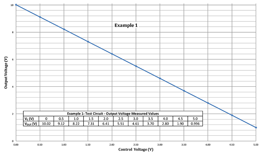 在此示例中,我們希望使用從05.0V的控制電壓來生成從1.0V10.0V的輸出電壓,即,在Cmax = 5.0V時出現(xiàn)的OUTmin = 1.0V ,并且OUTmax = 10.0V(在C = 0 時發(fā)生)。