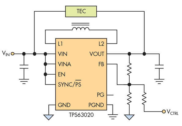 1中的電源是可以為低功率TEC提供和吸收電流的電路。例如,使用降壓/升壓轉(zhuǎn)換器(例如TPS63020)對(duì)提供的輸入電壓進(jìn)行降壓或升壓,以生成所需的電流方向。降壓-升壓轉(zhuǎn)換器的拓?fù)渲С州^寬的輸出電壓范圍,在這種情況下為1.25.5V。
