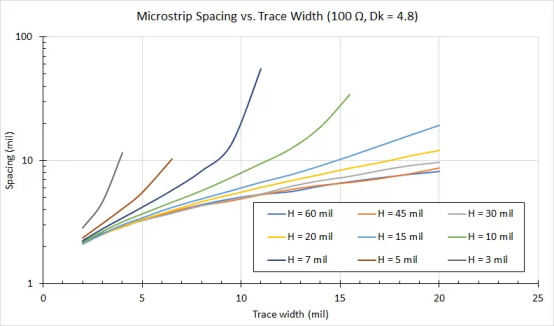 1. 間距和寬度值對將在不同厚度的 Dk = 4.8基板上提供100歐姆的差分阻抗。